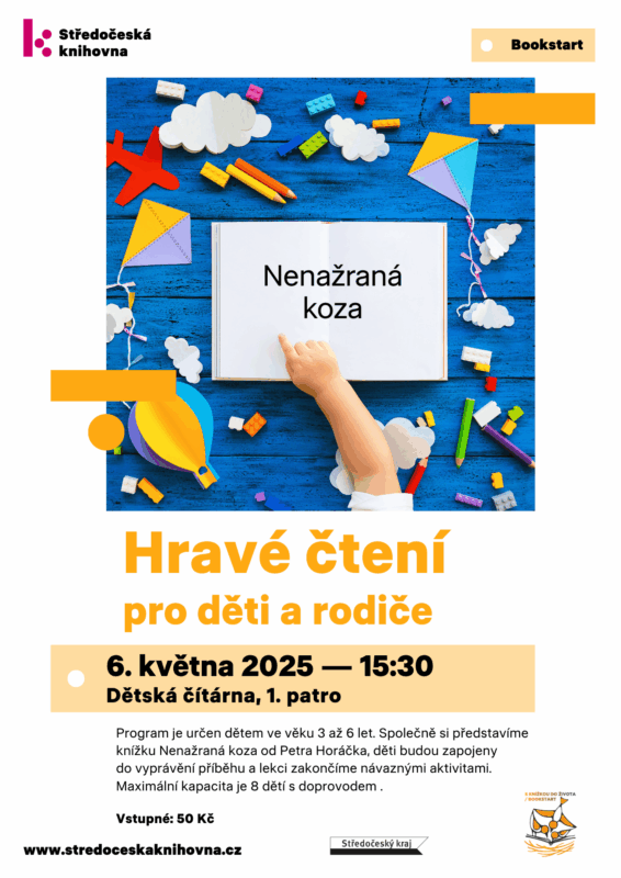 Program je určen dětem ve věku 3 až 6 let a doprovázejícím osobám. Společně si představíme knížku Nenažraná koza od Petra Horáčka, děti budou zapojeny do vyprávění příběhu a lekci zakončíme návaznými aktivitami. Maximální kapacita je 9 dětí s doprovodem.