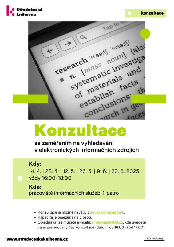 Konzultace je možné navštívit pouze po objednání, kapacita je omezena na 5 osob. Rezervaci termínů můžete provést na e-mail: simlova@svkkl.cz, případně na e-mail: volf@svkkl.cz, kde uvedete: