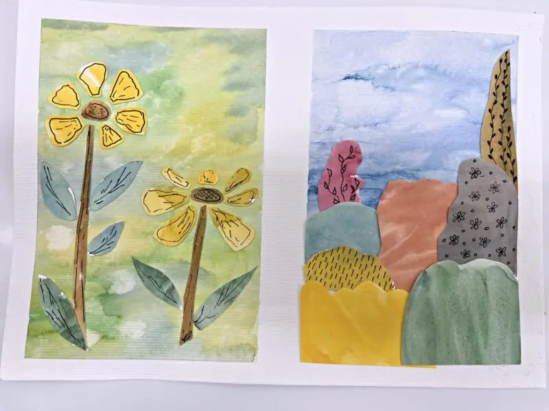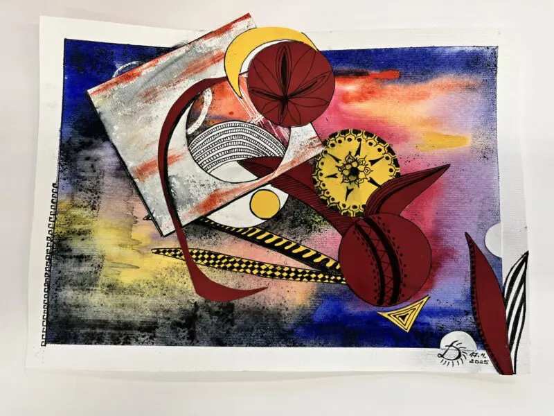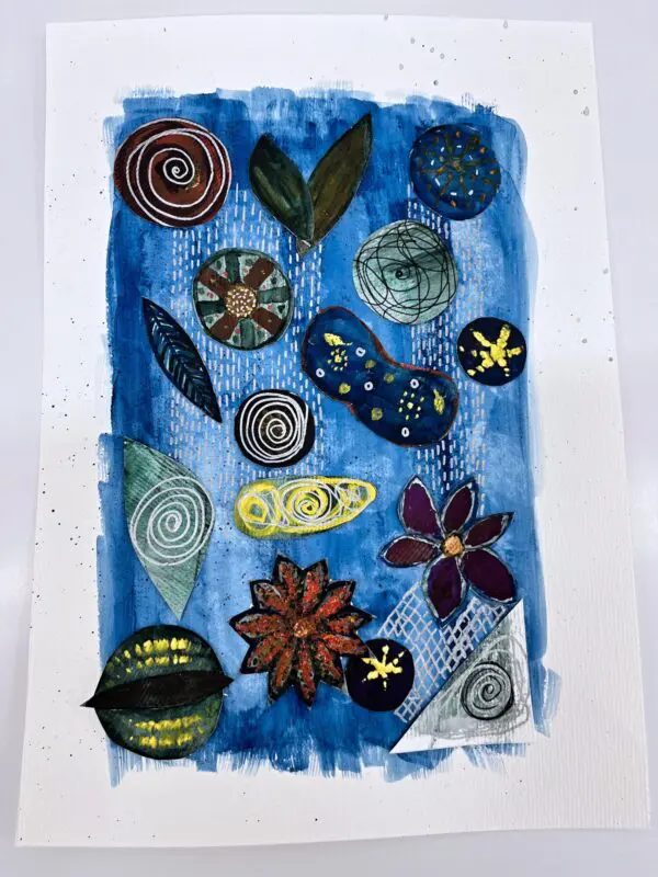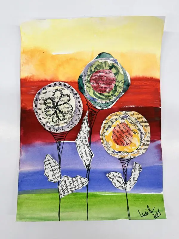 Kombinovaná technika opět trochu jinak. Základem zůstanou akvarelové barvy a linery jako v minulé hodině, ovšem tentokrát si s vytvořenými základy pohrajeme s nůžkami a lepidlem a pokusíme se z původně zcela náhodných motivů vytvořit koláž.