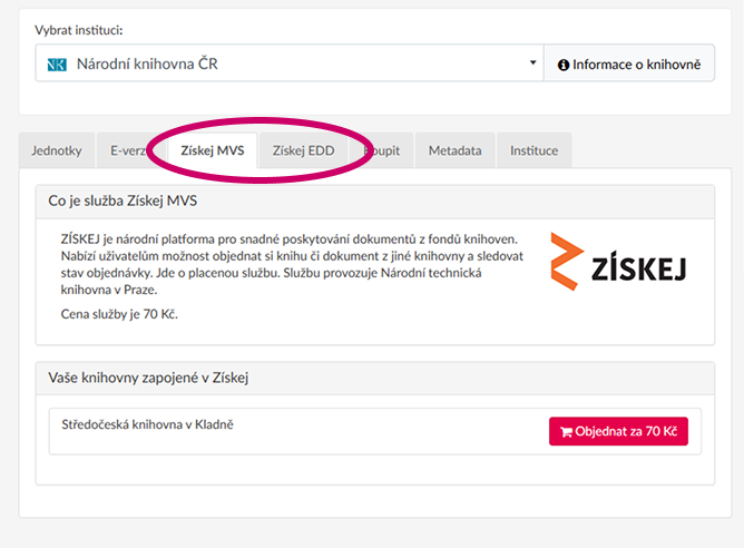 • V nabídce vyberte instituci, ze které chcete dokument poslat (knihovnu, která má titul ve fondu). Poté zvolte Získej MVS (pro zaslání fyzického výtisku) nebo Získej EDD (pro zaslání digitální kopie části knihy či článku).