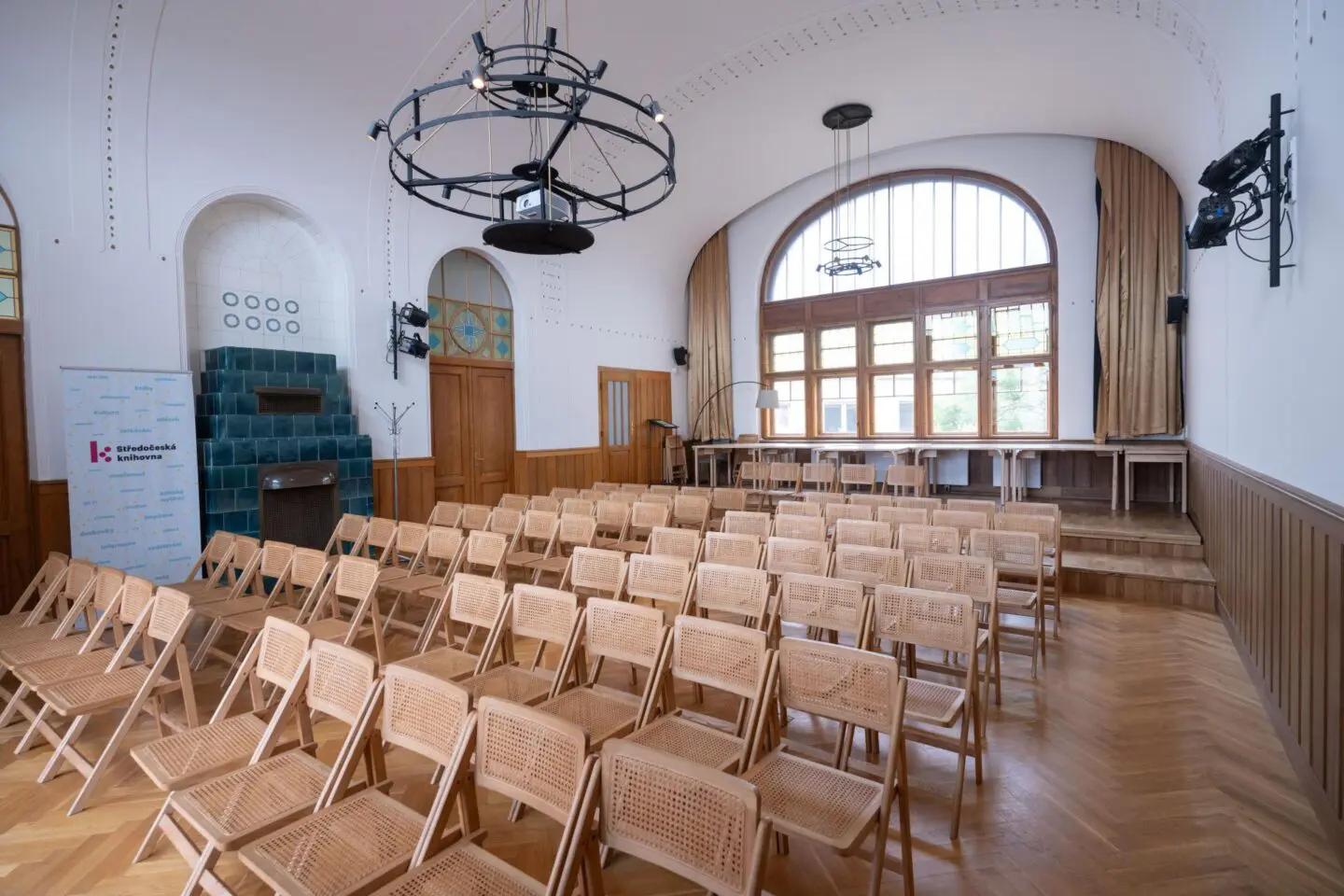 Reprezentativní prostor knihovny. Kdysi tady zasedalo okresní zastupitelstvo, dnes se tu odehrávají vzdělávací, kulturní i společenské akce. A když se v sále zrovna nic neděje, je k dispozici všem uživatelům i jako zázemí pro čtení či relax.